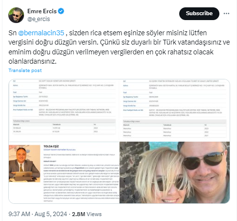 İmamoğlu'nun tutuklanmasının ardından hastanelik olan Berna Laçin'in kocası Tolga Eşiz’in vergi levhası yeniden gündem oldu.
